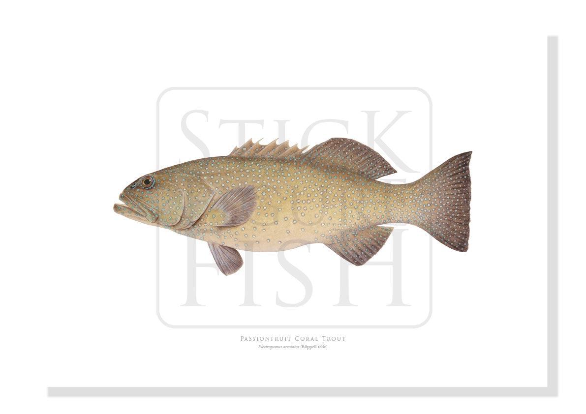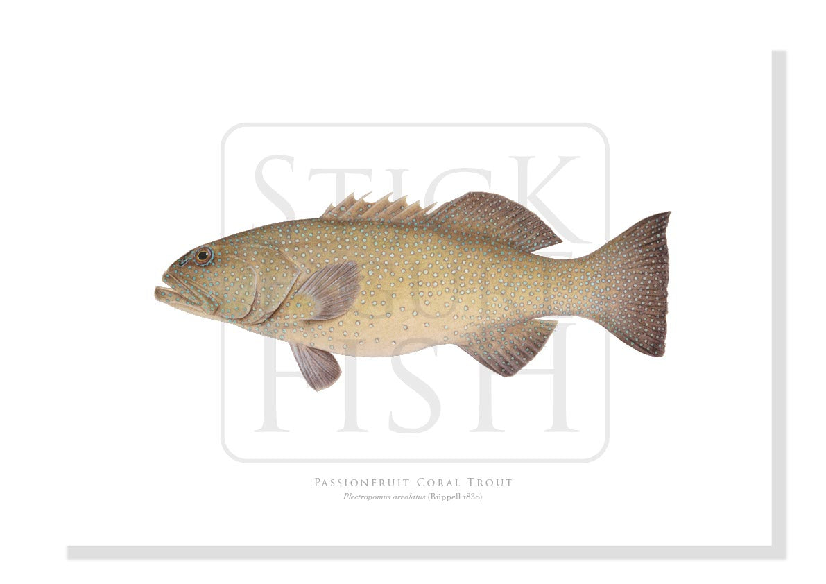 Discover the allure of marine biodiversity with my intricately illustrated Passionfruit Coral Trout, Plectropomus areolatus. Distinguished by its vibrant colouration and distinctive markings reminiscent of a passionfruit's surface, this species is a true marvel of the coral reefs. Drawing from my profound background as a preeminent fisheries biologist and a respected natural history artist, I've rendered the Coral Trout with a blend of scientific accuracy and artistic sensitivity. Adding this print to your collection is not only an appreciation of the Passionfruit Coral Trout's striking beauty but also a testament to the depth and breadth of marine wonders that I've devoted my life to documenting and preserving.