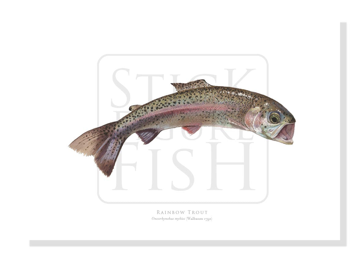The natural beauty of this artfully illustrated Rainbow Trout, Oncorhynchus mykiss, print will add life and color to any fishing enthusiast's home. Expertly drawn by artist Dr. Lindsay Marshall and printed on high-quality paper, this freshwater trout print will delight any angler looking to capture a slice of the serenity of river life.