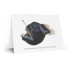 Become the talk of the deep sea with this eco-friendly illustrated greeting card featuring Melanocetus johnsonii, the famous Humpback Blackdevil anglerfish. Perfect for any marine biology enthusiast or ocean lover in your life, this deep and dark card features a stunning illustration of the mysterious blackdevil anglerfish and its signature bioluminescent lure.