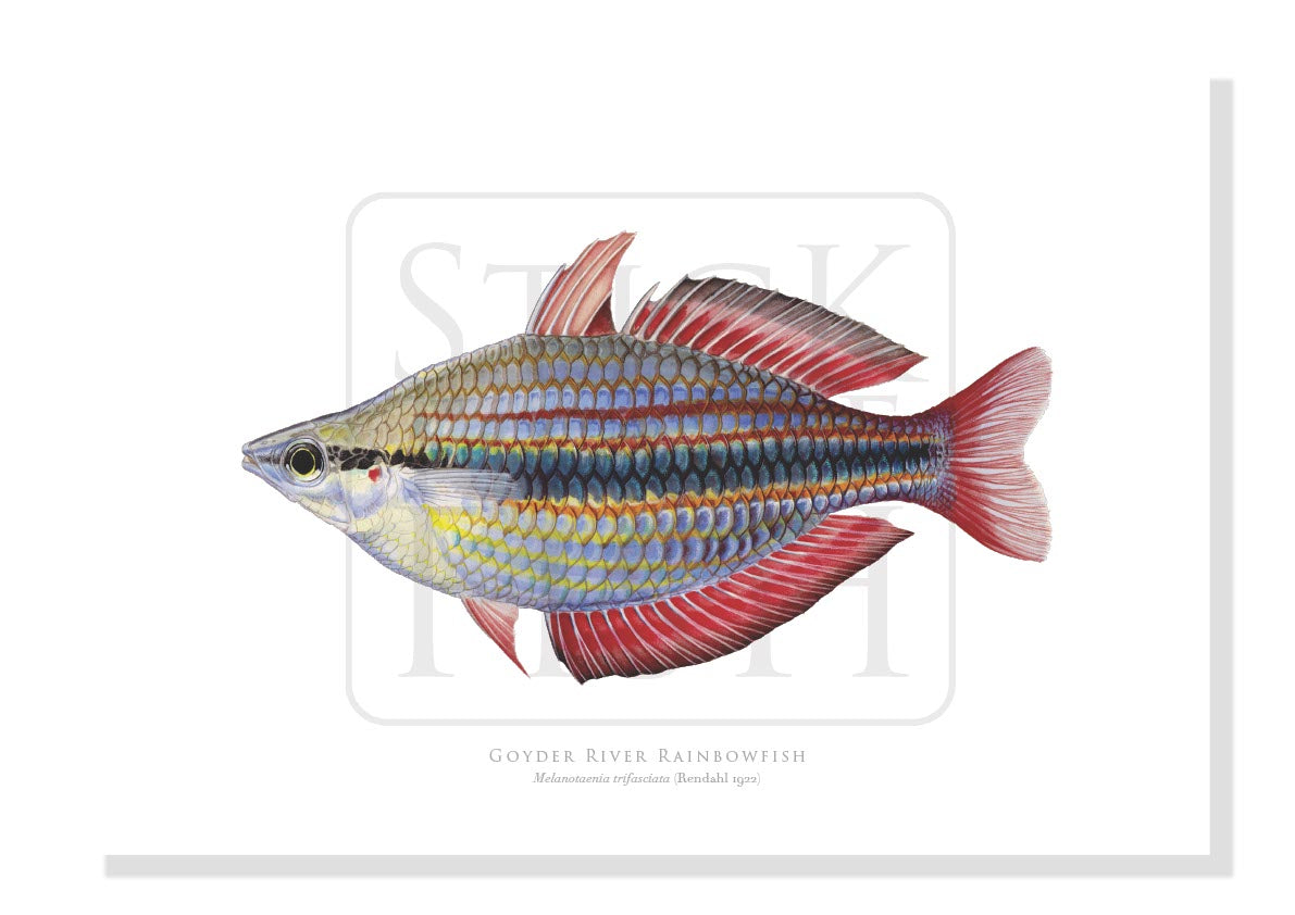 This vibrant fine art print brings the colourful wonder of Australia's Goyder River into your home. Scientifically accurate yet whimsically stylized, the rainbowfish's iridescent scales shimmer with shades of cobalt, scarlet and saffron. The intricate details of the fish's anatomy are balanced with a minimalist esthetic, giving it a sense of movement and life that leaps off the page. Created by natural history illustrator Dr. Lindsay Marshall, this print captures the dazzling beauty of Melanotaenia trifasciata in painstaking detail. Whether you're an ichthyology enthusiast, art collector, aquarist, or simply wish to add a splash of visual intrigue to your space, this rainbowfish is sure to make a splash. Available in three sizes, this high-quality print is perfect for framing and makes an unforgettable gift for the eco-conscious art lover in your life.