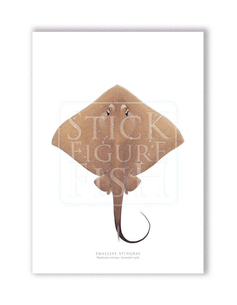 Bring the beauty of the deep to your space with this detailed illustration of the Smalleye Stingray (Megatrygon microps). This striking species, with its broad, disc-shaped body covered in star-shaped dermal denticles, is one of the largest stingrays in the world. Its rich reddish-brown colouring, accented with distinctive clusters of white spots, reflects the subtle elegance of this elusive marine giant.