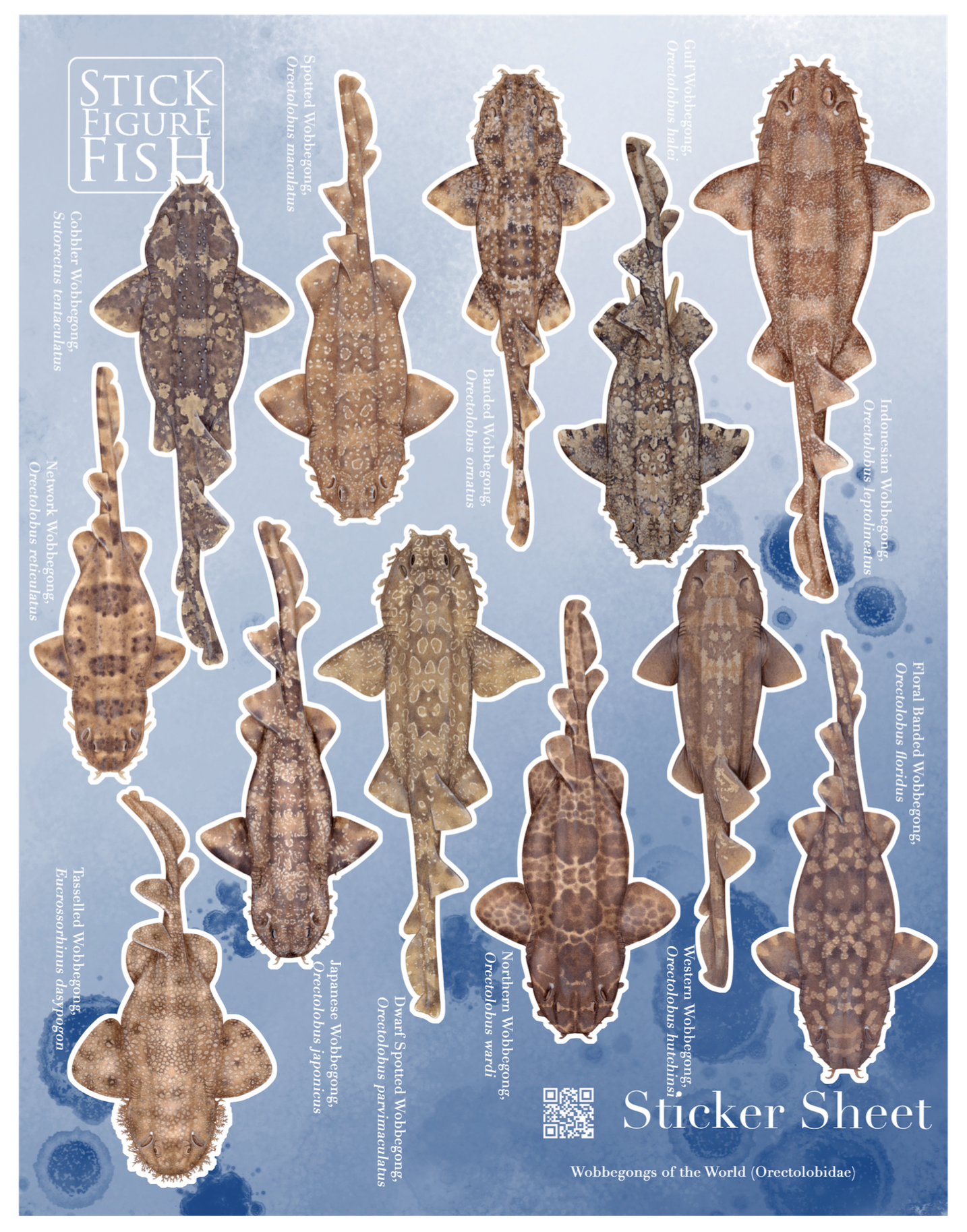 Discover the intriguing world of wobbegong sharks with this unique sticker sheet, featuring all twelve species of these intricately patterned carpet sharks. From the iconic Spotted Wobbegong (Orectolobus maculatus) to the Tasselled Wobbegong (Eucrossorhinus dasypogon), each shark is illustrated with Lindsay's world renown precision and care, capturing their distinctive camouflage and natural beauty.