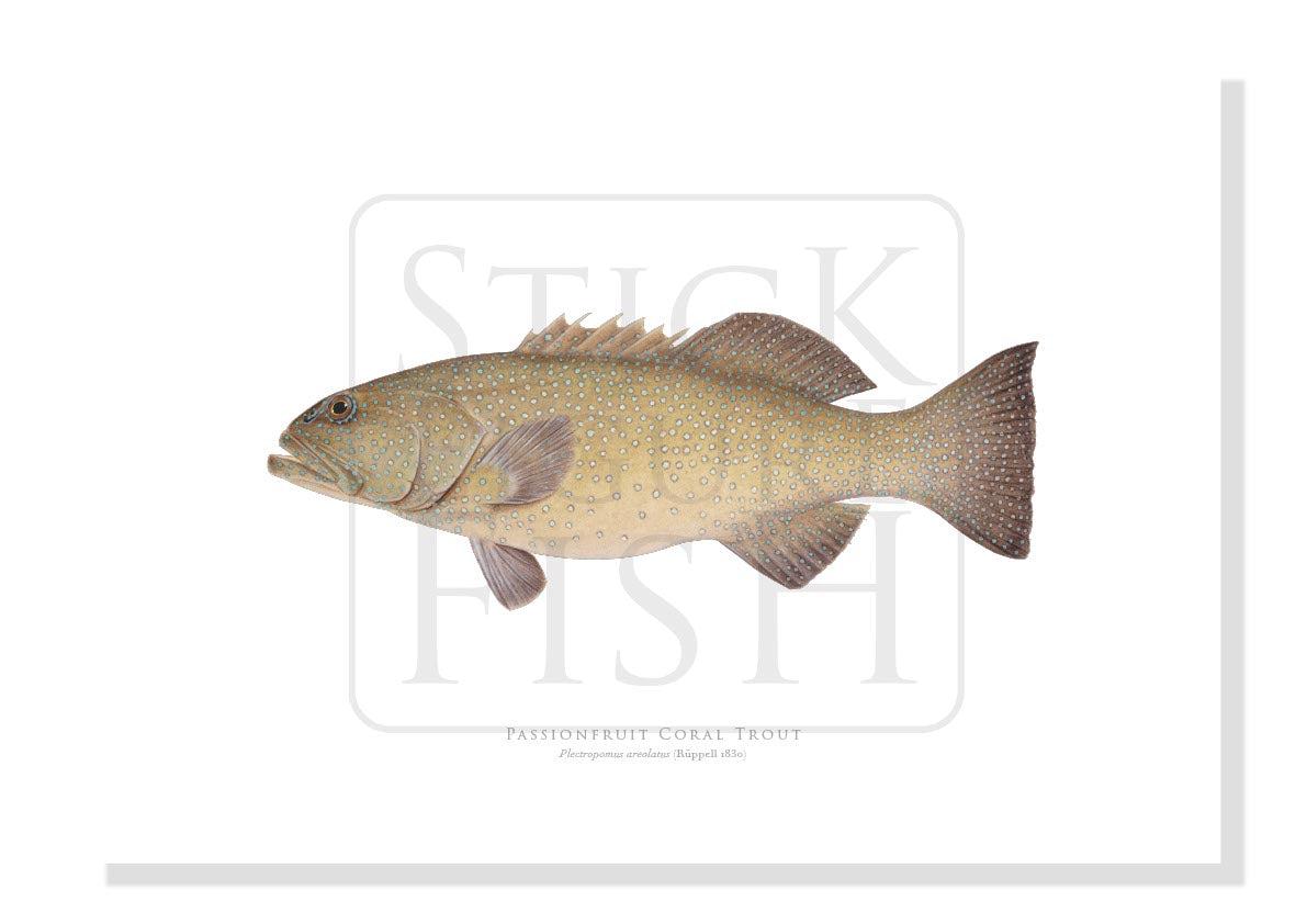 Discover the allure of marine biodiversity with my intricately illustrated Passionfruit Coral Trout, Plectropomus areolatus. Distinguished by its vibrant colouration and distinctive markings reminiscent of a passionfruit's surface, this species is a true marvel of the coral reefs. Drawing from my profound background as a preeminent fisheries biologist and a respected natural history artist, I've rendered the Coral Trout with a blend of scientific accuracy and artistic sensitivity. Adding this print to your collection is not only an appreciation of the Passionfruit Coral Trout's striking beauty but also a testament to the depth and breadth of marine wonders that I've devoted my life to documenting and preserving.